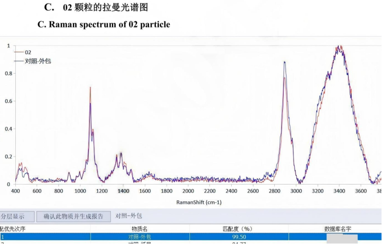 第二批樣品中,纖維素顆粒與 “外包裝” 匹配度 99.50%、與 “紙屑” 匹配度 94.77%,進一步鎖定異物可能來自產品包裝開封或轉運環節;