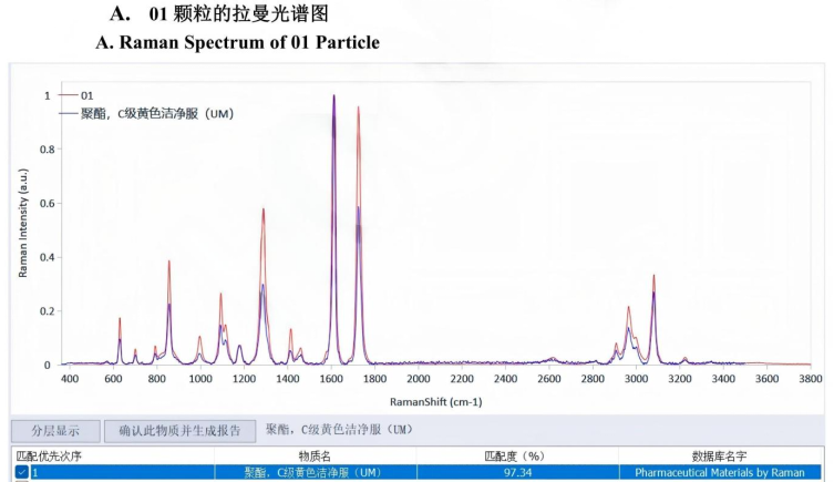 a.案例佐證:在某批樣品中,聚酯顆粒與 “C 級黃色潔凈服”“無塵布” 的匹配度達 97.34%,結合生產流程可推斷異物可能來自潔凈區人員著裝脫落;